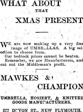 WHAT ABOUT THAT XMAS PRESENT VU’E are now making up a very fine range of UMBRELLAS. A big selection to choose from. Our bedrock prices cannot be beaten. Remember, we are Manufacturers, and cut out the Middleman’s profit. MAWKES &’ CHAMPION UMBRELLA, HOSIERY, & KNITTED GOODS MANUFACTURERS. 277 DFVON ST., NEW PLYMOUTH.