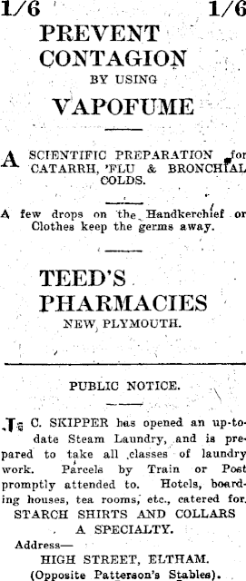 1/6 1/6 PREVENT CONTAGION BY USING VAPOFUME A SCIENTIFIC PREPARATION _for CATARRH, ’FLU & BRONCHIAL COLDS. A few drops on the. Handkerchief or Clothes keep the germs away. TEED’S PHARMACIES NEW PLYMOUTH. PUBLIC NOTICE. 0. SKIPPER has opened, an up-to-date Steam Laundry, and is prepared to take all .classes of laundry work. Parcels by Train or Poet promptly attended to. Hotels, boarding houses, tea rooms, etc., catered for. STARCH SHIRTS AND COLLARS A SPECIALTY. Address— HIGH STREET, ELTHAM. (Opposite Patterson’s Stables).