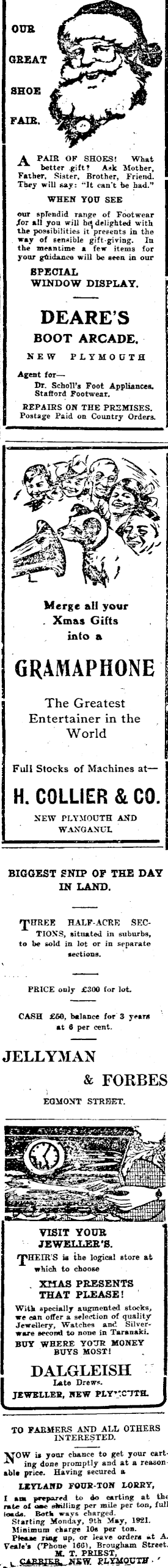 OUR GREAT IfLe — SHOE " Jfc FAIR. A PAIR OF SHOES! What better gift? Ask Mother, Father. Sister. Brother, Friend. They will say: "It can’t be had.” WHEN YOU SEE our splendid range of Footwear Xor al! you will bet delighted with the possibilities it presents in the way of sensible gift-giving. In the meantime a few items for your guidance will be seen in our SPECIAL WINDOW DISPLAY. DEARE’S BOOT ARCADE. NEW PLYMOUTH Agent for— Dr. Scholl’s Foot Appliances. Stafford Footwear. REPAIRS ON THE PREMISES. Postage Paid on Country Orders. Sv Merge all your Xmas Gifts into a GRAMAPHONE ! j The Greatest Entertainer in the World Full Stocks of Machines at — H. COLLIER & CO. NEW PLYMOUTH AND WANGANUL BIGGEST SNIP OF THE DAY IN LAND. rjHREE HALF-ACRE SECTIONS, situated in suburbs, to be sold in lot or in separate sections. PRICE only £3OO for lot. CASH £5O, balance for 3 year* at 6 per cent. JELLYMAN & FORBES EGMONT STREET. VISIT YOUR JEWELLER’S. is the logical store at which to choose XMAS PRESENTS THAT PLEASE! With specially augmented stocks,, we can offer a selection of quality Jewellery, Watches and Silverware second to none in Taranaki. BUY WHERE YOUR MONEY BUYS MOST! DALGLEISH Late Drew*. JEWELLER, NEW PLYMOUTH. TO FARMERS AND ALL OTHERS INTERESTED. VOW is your chance to get your carting done promptly and at a reasonable price. Having secured a LEYLAND FOUR-TON LORRY, I am prepared to do carting at the rate of shrilling per mile per ton, full loads. Both ways charged. Starting Monday, 9th May, 1921. Minimum charge 10s per ton. Please ring up. or leave orders *t A. Veale’s UPhone" 166), Brougham Street. M. T. PRIEST, L u CARRjTKR. NEW PLYMOUTH