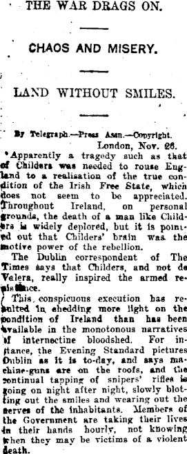 THE WAR DRAGS ON. CHAOS AND MISERY. LAND WITHOUT SMILES. By Telegraph—Press Assn.—Copyright. London, Nov. 26. •Apparently a tragedy such as that of Childers was needed to rouse England to a realisation of the true condition of the Irish Free State, which does not seem to be appreciated, throughout Ireland. on personal grounds, the death of a man like Child* ters id widely deplored, but it is pointed out that Childers’ brain was the motive power of the rebellion. The Dublin correspondent of The Times says that Childers, and not de Valera, really inspired the armed ref Ais conspicuous execution has resulted In ehedding more light on the condition of Ireland than has been Available in the monotonous narratives >f internectine bloodshed. For instance, the Evening Standard pictures Dublin as it is to-day, and says ma-chine-guns are on the roofs, and the ?ontinual tapping of snipers’ rifles is going on night after night, slowly blotting out the smiles and wearing out the nerves of the inhabitants. Members of the Government are taking their lives in their hands hourly, not knowing When they may be victims of a violent death.