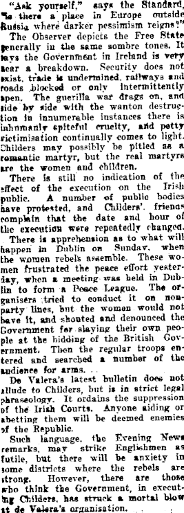 “Ask yourself,” says the Standard, there a place in Europe outside Russia where darker pessimism reigns?’ The Observer depicts the Free State generally* in the same sombre tones. It lays the Government in Ireland is very Sear a breakdown. Security does not Heist, trade te undermined, railways and foads blocked cr only intermittently apen. The guerilla war drags on. and lide- by side with the wanton destruction in innumerable instances there is inhumanly spiteful cruelty, arid petty victimisation continually comes to light. Childers may possibly be pitied a« a romantic martyr, but the real martyrs are the women and children. There is still no indication of the effect of the execution on the Irish public. A number of public bodies have protested, and Childers’ friends complain that the date and hour of the execution were repeatedly changed. There is apprehension as to what will happen in Dublin on Sunday, when the women rebels assemble. These women frustrated the peace effort yesterday. when a meeting was held in Dublin to form a Peace League. The organisers tried to conduct it on nonparty lines, but the women would not have it, and shouted and denounced the Government for slaying their own people at the bidding of the British Government. Tlren the regular troops entered and searched a number of the audience for arms. De Valera’s latest bulletin doee not illude to Childers, but is in strict legal ?hraseologv. It ordains the suppression i>f the Irish Courts. Anyone aiding or abetting them will be deemed enemies of the Republic. Such language, the Evening News remarks, may strike Englishmen as futile, but there will be anxiety in some districts where the rebels are ttrong. However, there are those mho think the Government, in executing Childers, has struck a mortal blow it de Valera's organisation.