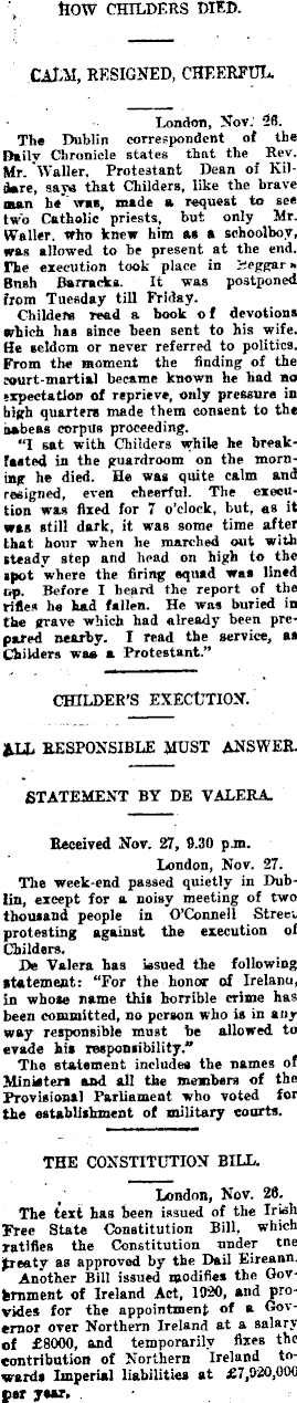 HOW CHILDERS DIED. CALM, RESIGNED, CHEERFUL. London, Nov. 26. The Dublin correspondent of the Daily Chronicle states that the Mr. Waller. Protestant Dean of Kildare, sayfl that Childers, like the brave man he" was, made a request to see two Catholic priests, but only Mr. Waller, who knew him as a schoolboy, was allowed to be present at the end. The execution took place in beggar»» Bnsh Barracks. It was postponed from Tuesday till Friday. Childere read a book of devotions which has since been sent to his wife. He seldom or never referred to politics. From the moment the finding of the court-martial became known he had no expectation of reprieve, only pressure in high quarters made them consent to the nabeas corpus proceeding. “I sat with Childers while he breakfasted in the guardroom on the morning he died. He was quite calm and resigned, even cheerful. The execution was fixed for 7 o’clock, but, as it was still dark, it was some time after that hour when he marched out with steady step and head on high to the spot where the firing squad was lined up. Before I heard the report of the rifles he had fallen. He was buried in the grave which had already been prepared nearby. I read the service, as Childers was a Protestant.” CHILDER’S EXECUTION. ALL RESPONSIBLE MUST ANSWER. STATEMENT BY DE VALERA. Received Nov. 27, 9.30 pjn. London, Nov. 27. The week-end passed quietly in Dublin, except for a noisy meeting of two thousand people in O’Connell Street protesting against the execution of Childers. De Valera has issued the following statement: “For the honor of Irelanu, in whose name this horrible crime has been committed, no person who is in any way responsible must be allowed to evade his responsibility” The statement includes the names of Ministers and all the members of the Provisional Parliament who voted for the establishment of military courts. THE CONSTITUTION BILL. London, Nov. 26. The text has been issued of the Irish Free State Constitution Bill, which ratifies the Constitution under tne jtreaty as approved by the Dail Eireann. Another Bill issued modifies the Government of Ireland Act, 1920, and provides for the appointment of a Governor over Northern Ireland at a salary of £BOOO, and temporarily fixes the contribution of Northern Ireland towards Imperial liabilities at £7,920.000 per year.