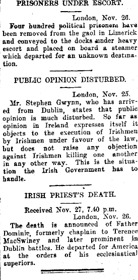 PRISONERS UNDER ESCORT. London, Nov. 26. Four hundred political prisoners have been removed from the gaol in Limerick and conveyed to the docks amder heavy escort and placed on board a steamer which departed for an unknown destination. PUBLIC OPINION DISTURBED. London, Nov. 25. Mr. Stephen Gwynn, who has arrived from Dublin, states that public opinion is much disturbed. So far aK opinion in Ireland expresses itself it objects to the execution of Irishmen by Irishmen under favour of the law, but does not raise any objection i against Irishmen killing one another in anv other way. This is the situation ’the Irish "Government has to handle. IRISH PRIEST’S DEATH. Received Nov. 27, 7.40 p.m. London, Nov. 26. The death is announced of Father Dominic, formerly chaplain to Terence MacSwiney and later prominent in Dublin battles. He departed for America at the orders of his ecclesiastical superiors.