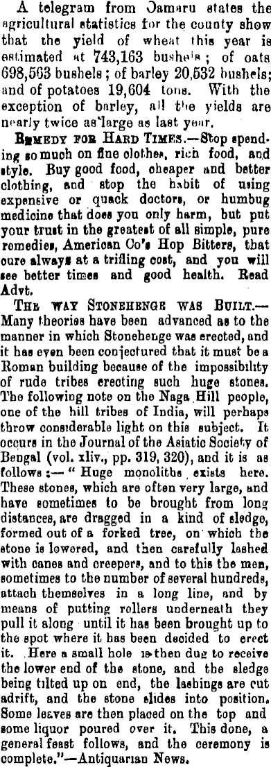 A telegram from Oamnru states the agricultural statistics tor the county show that the yield of wheat this year is estimated «t 743,163 bushu l * ; of oats 698,503 bushels; of barley 20,532 bushels; and of potatoes 19,604 tons. With the exception of barley, all fie yields are nearly twice as'large as last year. Biuest fob Haed Times.—Stop spending somuoh on fine olothen, rich food, and ityle. Buy good food, cheaper and better clothing, and stop the habit of using expensive or quack doctors, or humbug medicine that does you only harm, but put your truit in the greateit of all simple, pure romediei, American Go's Hop Bitters, that oure alwayf at a trifling cost, and you will lee better times and good health. Bead Advt. Thb way Stonehbngb was Built.— Many tbeoriss hare been advanced as to the manner in which Stonehenge was erected, and it has even been conjectured that it must be a Roman building because of the impossibility of rude tribes erecting such huge stones. The following note on the Naga Hill people, one of the hill tribes of India, will perhaps throw considerable light on this subject. It occurs in the Journal of the Asiatic Society of Bengal (vol. xliv., pp. 319, 320), and it is as follows j— " Huge monoliths, exists here. These stones, which are often very large, and have sometimes to be brought from long distances, are dragged in a kind of sledge, formed out of a forked tree, on whioh tbe stone is lowered, and then carefully lashed with canes and oreepers, and to this the men, sometimes to the number of several hundreds, attach themselves in a long line, and by means of putting rollers underneath they pull it along until it has been brought up to the spot where it has been decided to erect it. Here a small hole i»then dug to receive the lower end of the stone, and tbe sledge being tilted up on end, the lashings are rut adrift, and the stone slides into position. Some leaves are then placed on the top and some liquor poured over it. This done, a general feast follows, and the ceremony is complete."—Antiquarian News.