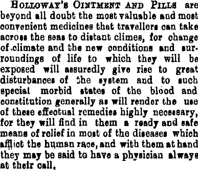 Holloway'b Ointment and Fills are beyond all doubt the most valuable and most convenient medioines that travellers can take across the seas to distant climes, for ohange of-climate and the new conditions and surroundings of life to which they will be exposed will assuredly give rise to great disturbances of the system and to such special morbid states of the blood and constitution generally as will render the use of these effectual remedies highly neoeisary, for they will find in them a ready and safe means of relief in most of the diseases which efliot the htunan raoe, and with them at hand they may be said to have a physician always at their call,