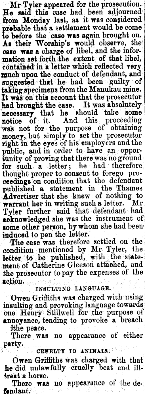 Mr Tyler appeared for the prosecution. He said this case had been adjourned from Monday last, as it was considered probable that a settlement would be come to before the case was again brought on. As their Worship's would observe, the case was a charge of libel, and the information set forth the extent of that libel, contained in a letter which reflected very much upon the conduct of defendant, and suggested that he had been guilty of taking specimens from the Manukau mine. It was on this account that the prosecutor had brought the case. It was absolutely necessary that he should take some notice of it. And this proceeding was not for the purpose of obtaining money,-but simply to set the prosecutor right in the eyes of his employers and the public, and in order to have an opportunity of proving that there was no ground for such a letter; he had therefore thought proper to consent to forego proceedings on condition that the defendant published a statement in the Thames Advertiser that she knew of nothing to warrant her in writing such a letter. Mr Tyler further said that defendant had | acknowledged she was the instrument of some other person, by whom she had been* induced io pen the letter. The case was therefore settled on the condition mentioned by Mr Tyler, the letter to :be published, with; the statement of Catherine Gleeson attached, and the prosecutor to pay the expenses of the action. INSULTING LANGUAGE. Owen Grifliths was charged with using insulting and provoking language towards one Henry Stillwell for the purpose of annoyance, tending to provoke a breach jthe peace. There was no appearance of either party. CB¥ELTY TO ANINALS. Owen Griffiths was charged with that he did unlawfully cruelly beat and illtreat ahorse. There was no appearance of the defendant. ■-■■ •■■••-