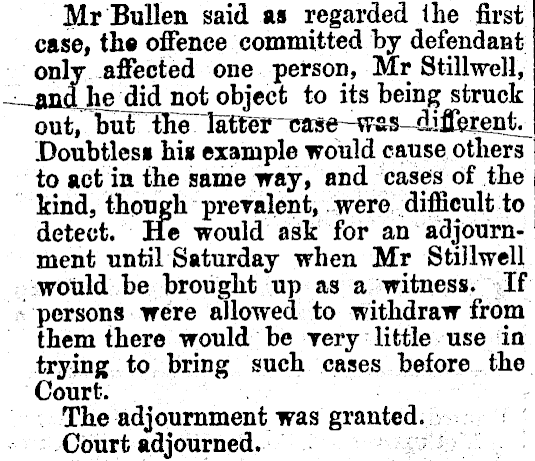 Mr Bullen said as regarded the first case, th« offence committed by defendant only affected one person, Mr Stillwell,;' -^-init^did not object to its being struck out, buOhe TaKeT-Tmse-wss-diflkent^ Doubtless his example would cause others to act in the same way, and cases of the kind, though preralent, were difficult to detect. He would ask for an adjournment until Saturday when Mr StiJlwell would be brought up as a witness. If persons were allowed to withdraw from them there would be rery little use in trying to bring such cases before the Court. The adjournment was granted. Court adjourned.