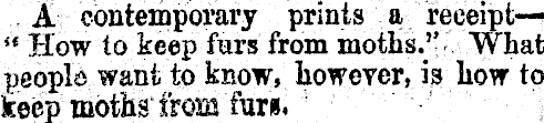 £r conteibporary prints a receipt— v How to keep furs from moths.'* What people want to know, however, is how to keep moths IVom fur*.