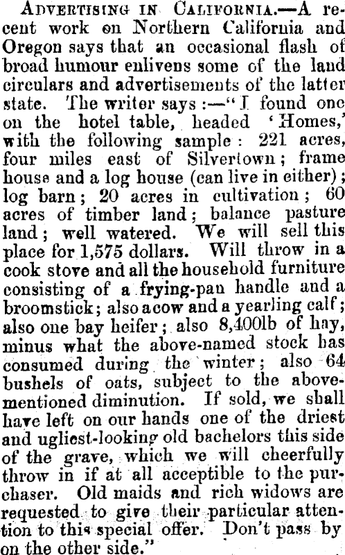 Advertising in California.—A recent work on Northern California and Oregon says that an occasional flash of broad humour enlivens some of the land circulars and advertisements of the latter state. The writer says : —" I found one on the hotel table, headed ' Homes,' with the following sample : 221 acres, four miles east of Silveriown; frame house and a log house (can live in either); log barn; 20 acres in cultivation ; 60 acres of timber land; balance pasture land; well watered. We will sell this place for 1,575 dollars. Will throw in a cook stove and all the household furniture consisting of a frying-pan handle and a broomstick; alsoacow and a yearling calf; also one bay heifer; also 8,4001b of hay, minus what the above-named stock has consumed during the winter; also 64 bushels of oats, subject to the abovementioned diminution. If sold, we shall have left on our hands one of the driest ani ugliest-looking old bachelors this side of the grave, which we will cheerfully throw in if at all acceptable to the purchaser. Old maids and rich widows are requested to give tbeir -particular attention to thi* special offer. Don't pass by on the other side." \