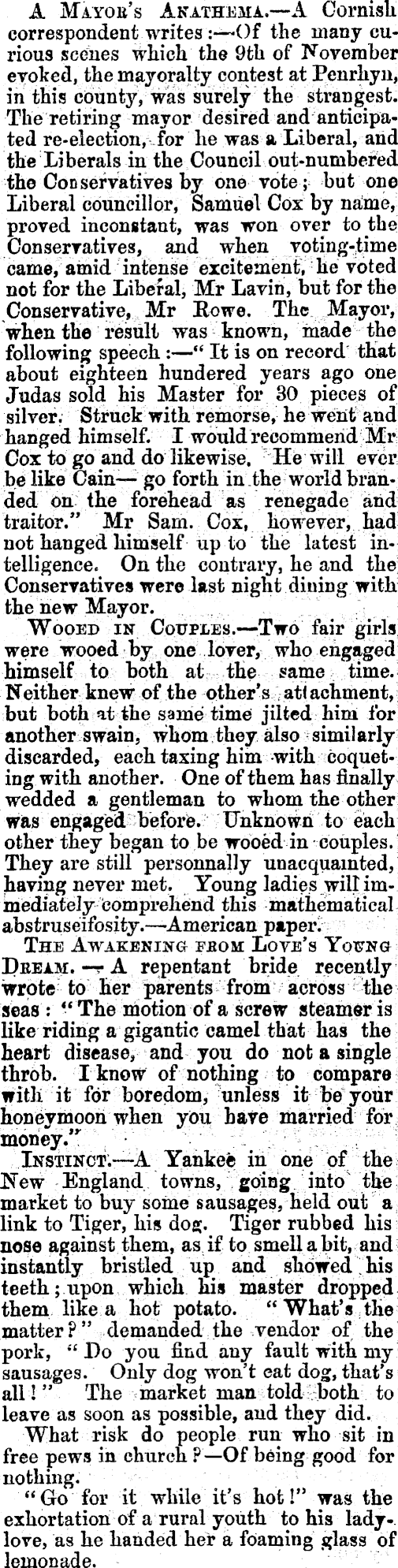 A Mayob's Akathema.—A Cornisli correspondent writes :-—Of the many curious scenes which the 9th of November eyoked, the mayoralty contest at Penrhyn, in this county, was surely the strangest. The retiring mayor desired and anticipated re-election, .for he was a Liberal, and the Liberals in the Council out-numbered the Conservatives by one vote; but one Liberal councillor, Samuel Cox by name, proved inconstant, was won over to the Conservatives, and when voting-time Came, amid intense excitement, lie voted I not for the Liberal, Mr Lavin, but for the Conservative, Mr Howe. The Mayor, when the result was known, made the following speech :—" It is on record' that about eighteen hundered years ago one Judas sold his Master for 30 pieces of silver. Struck with remorse, he went and hanged himself. I would recommend Mr Cox to go and do likewise. He will ever be like Cain— go forth in the world branded on the forehead as renegade and traitor." Mr Sam. Cox, however, had not hanged himself up to the latest intelligence. On the contrary, he and the; Conservatives were last night dining with the new Mayor. Wooed in Couples.—Two fair girls were wooed by one lover, who engaged himself to both at the same time. Neither knew of the other's attachment, but both at the same time jilted him for another swain, whom they also similarly discarded, each taxing him with coqueting with another. One of them has finally wedded a gentleman to whom the other was 'engage'd-before.:.:"''>.lJnkiibwii to each other they began to be wooed in couples. They are still personnally unacquainted, having never met. Young ladies will immediately comprehend this mathematical abstruseifosity.—American paper. The Awakening fbom Love's Yofng I)eeam. —r A repentant bride recently wrpte^ to Her from across seas : " The motion of a screw steamer is like riding a gigantic camel that has the heart disease, and you do not a single throb. I know of nothing to compare with it for boredom, unless it be your honeymoon when you have married for money." Instinct.—A Yankee in one of the New England towns, going into the market to buy some sausages, held out a link to Tiger, his dog. Tiger rubbed his nose against them, as if to smell a bit, and instantly bristled up and showed his teeth; upon which his master dropped them like a hot potato. "■What's the matter?" demanded the vendor of the pork, "Do you find any fault witn my sausages. Only dog won't eat dog, that's all! " The market man told^both to leave as soon as possible, and they did. What risk do people run who sit in free pews in church ?—Of being good for nothing. "Go for it while it's hot!" was the exhortation of a rural youth to his ladylove, as he handed her a foaming glass of lemonade.