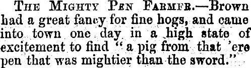 The Mighty P*n Fabmfb.-—Brown Lad a great fancy for fine hogs, and came intq town one '. day. in a JhigK state of excitement to find " a pig from that /ere pen that was mightier than the sword;"
