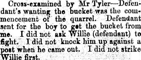 Cross-examined by Mr Tyler —Defendant's wanting the bucket was the commencement of the quarrel. Defendant sent for the boytojgrt the bucket from me. I did not ask "Willie (defendant) to fight." I did not knock him up against a post when he came out. I did not strike Willie first.