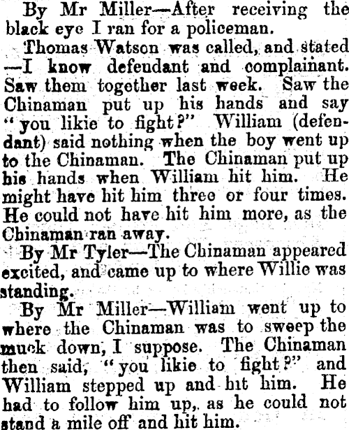 By Mr Miller—After receiving the black eye I ran for a policeman. Thomas Watson was called, and stated —I know defendant and complainant. Saw them together last week. Sjaw the Chinaman put up his hands and say "you likie to fight?" William (defendant) said nothing when the boy went up to the Chinaman. The Chinaman put up his hands when William hit him. He might have hit him three or four times. He could not have hit him more, as the Chinaman ran away. ' By Mr Tyler—The Chinaman appeared excited, and came up to where Willie was standing. By Mr Miller—William went up to where the Chinaman was to sweep the muck down, I suppose. The Chinaman then said, "you likie to fight?" and William stepped up and hit him. He had to follow him up,, as he could not stand a mile off and hit him.