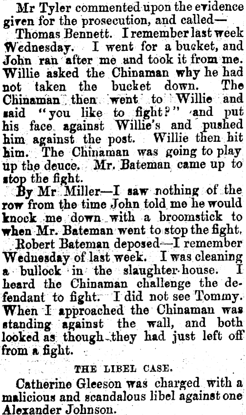 Mr Tyler commented upon the eridence giren for the prosecution, and cailedrThomas Bennett. I remember last week Wednesday. I went for a bucket, and John ran after me and took it from me. Willie asked the Chinaman why he had not taken the bucket down. The Chinaman then Iweht/ to r Willie and said "you like to fight?" and put his face, against Willies and' pushed him- against the post. Willie then hit kirn. The Chinaman was going to play 'tipioe!4wc^^^:iCr-''Bateinan, came up to stop the fight. By Mr Miller—l saw nothing of the row from the time John told me he would knock me down with a broomstick to when Mr. Bateman went to stop the fight, , Robert Bateman deposed--I remember Wednesday of last week. I was cleaning a bullock in the slaughterhouse. I heard the Chinaman challenge the defendant to fight. I did not see T'ominy. When I approached the Chinaman was standing against the wall, and both looked as though, .they had just left off from a fight. : / THE LIBEL CASE. Catherine Gleeson was charged with a malicious and scandalous libel against one Alexander Johnson.