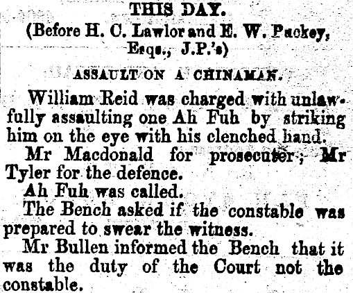 THIS DAT. (Before H. 0. Lawlor and E. W. P«ok«v. B« qi ., J.P.'t) ASSAULT ON A CHINAMiK, William Reid was charged with unlan • fully assaulting one Ah Fah by striking him on the eye with his clenched hand. Mr Macdonald for prosecutor;l Jffr Tyler for the defence. Ah. Fuh was called. The Bench asked if the constable was prepared to swear the witness. Mr Bullen informed the Bench that it was the duty of the Court not the constable.
