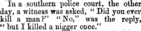 In a southern police court, the other day, a witness was asked, " Did you ever kill a man?" "No," was the reply, " but I tilled a, nigger once." ,