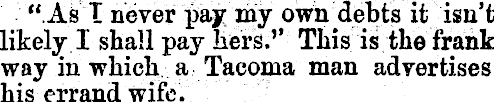 "As T never pay my own debts it isn't likely I shall pay hers.' 1 This is the frank way in which, a Tacoma man advertises his errand wife.