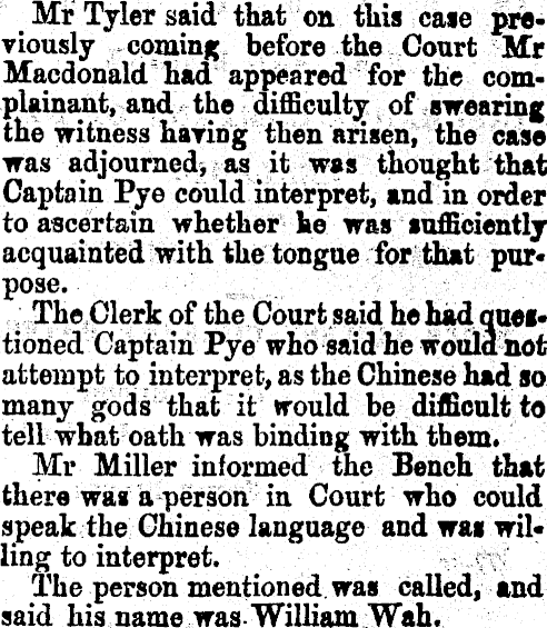 Mr Tyler said that on this case previously coming before the Court Mr Macdonald had appeared for the complainant, and the difficulty of swearing the witness haying then arisen, the ease was adjourned, as it was thought that Captain Pye could interpret, and in order to ascertain whether lie was sufficiently acquainted with the tongue for that pur« pose. The Clerk of the Court; said he had queitioned Captain Pye who said he would not attempt to interpret, as the Chinese had so many gods that it would be difficult to tell what oath was binding with them* Mr Miller informed the Bench that there was a person in Court who could speak the Chinese language and was willing to interpret. The person mentioned was called, and said his name was-William .Wah.