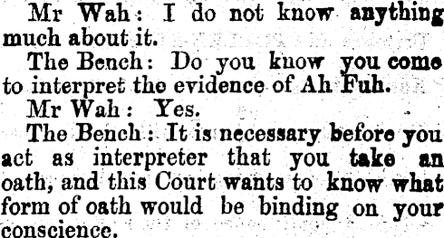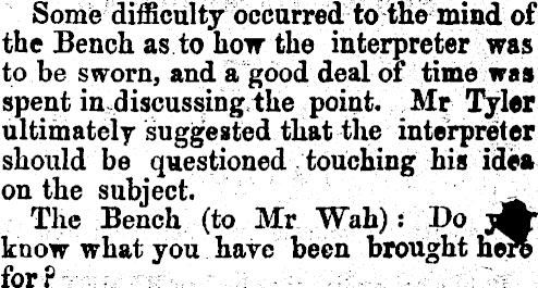 Some difficulty occurred to the mind of the Bench as to how the interpreter was to be sworn, and a good deal of time was spent in discussing,the point. Mr Tyler ultimately suggested that the interpreter should be questioned touching his idea on the subject. _ The Bench (to Mr Wah): Bo jA* know what you hare been brought hero for?