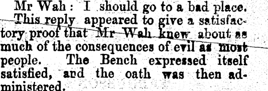 Mr Wah: Some break the saucer, and some blow the match out. The Bench: Do you believe in a God P Mr Wah : I believe in a God. Mr Tyler : Supposing that you blew out a match, and then spoke falsely as to the evidence, what would be the a result.