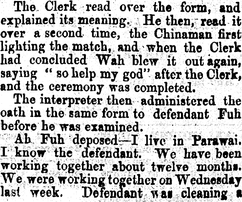 The. Clerk read orer the form, and explained its meaning. He then, read it over a second time, the Chinaman first lighting the match, and when the Clerk had concluded Wah blew it out again, saying " so help my god" after the Clerk, and the ceremony was completed. The interpreter then administered the oath in the same form to defendant Fuh before he was examined. . . ' Ah Fuh deposed—l lire in Parawai. I;know the defendant. We hare been working together about twelve months. We were working together on Wednesday last week. Defendant uai cleaning a