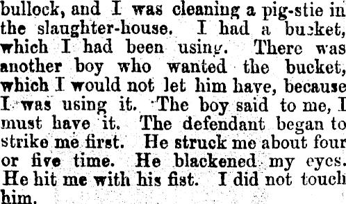 bullock, and I was cleaning a pig-stie in the slaughter-house. I had a bucket, which I had been usiny. There was another boy who wanted the bucket, which I would not let him have, because I was using it. The boy said to me, I must have it. The defendant began to strike me first. He struck me about four or fiye time. He blackened my eyes. He hit me with his fiat. I did not touch him.