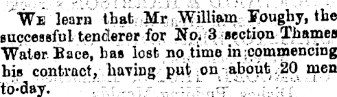 'We learn that Mr William Foughy, the successful tenderer for No. 3 -section Thames Water Bace, has lost no time in .commencing bis contract, having put on about 20 men to-day. V