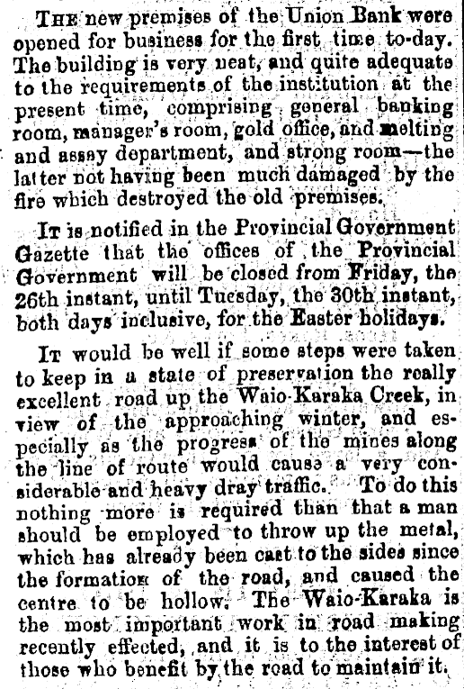 The new premises of the Union -Bank were opened for business for the firet tiree to-day. The building is very neat, and quite adequato to the requirements of the institution at the present time, comprising general banking room, manager's room, gold office, and Melting ' and assay department, and strong room—the latter not having been much damaged by the fire which destroyed the old premises., It is notified in the Provincial Government Gazette that the offices of , the Provincial Government will be closed from Friday, the 26th instant, until Tuesday, the 30th inatant, both days'inclusive, for the Easter holidays. It would be well if some steps were taken to keep in v state of preservation the really excellent road up the Waio-Karaka Creek, in view of the approaching winter, and especially as the progress of the mines along ! the line of route would causa a very considerable and heavy dray 1 traffic. To do this nothing more is required than that a man should be employed to throw up the metal, which haa already been caet to the sides since the formation of the road, and caused the centre to be hollow. * The Waio-Karaka is the most' important work" in 1 road making recently effected,, and it is to the interest of those who benefit by the road to maintain'it.