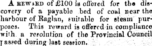 A EEWiBD of £100 is offered for tbo discoTery of a payable bed of coal near the harbour of Raglan, suitable for steam purposes. This l'eward is offered in compliance with, a resolution of the Provincial Council r assed during last session.