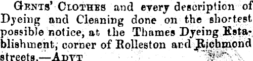 Gknts'Clothes and every description of Dyeing and Cleaning done on the shortest possible notice, at the Thames Dyeing Establishment, corner of Bolleston acd Richmond streets.—Adtt "" ; •*"•.,