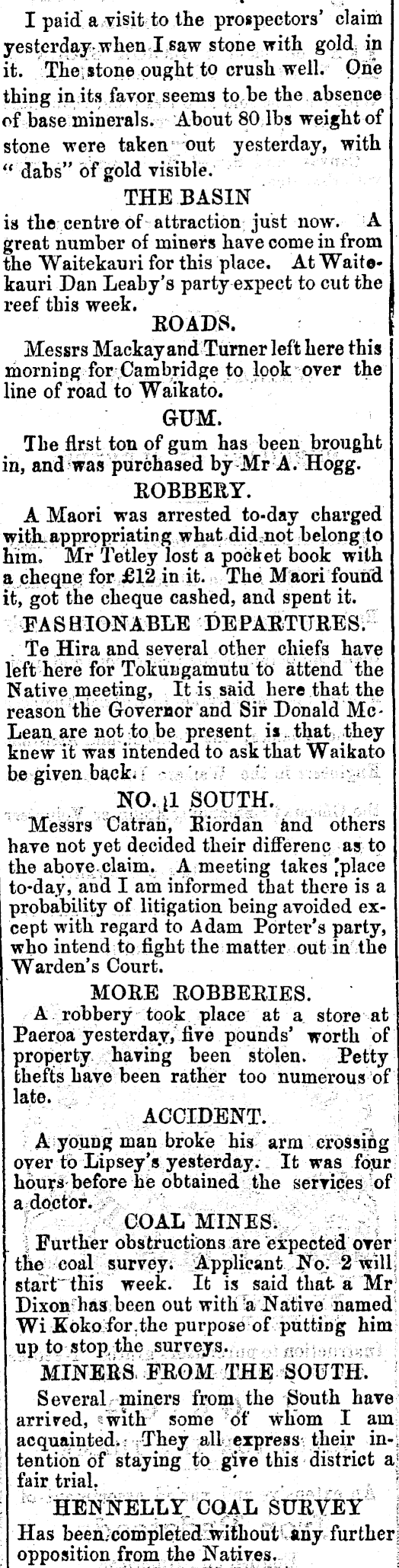I paid a .visit-to the prospectors' claim yesterday;when Isaw stone with gold; jn it. The; stone ought to crush well. One thing in its favor, seems to, be the absence of base minerals. About 80 lbs weight of stone were taken;out yesterday, with "dabs" of gold visible. THE BASIN is the centre of attraction; just now. A great number of miners have come in from the Waitekauri for this place. At Wait©kauri Dan Leahy's party expect to cut the reef this week. ROADS, Messrs Mackay and Turner left here this morning for Cambridge to look over the line of road to Waikato. GUM. The first ton of gum has been brought in, and?was purchased by Mr A. Hogg. ROBBERY. A Maori was arrested to-day charged with;, appropriating whatdid^npt belongitp him. Mr Tetley lost a pocket book with a cheque; for.£l2 in it. n The, Mftori fouiid it, got the cheque cashed, and spent it. FASHIONABLE DEPARTURES. . Te Hira and several other chiefs have left here for Tokuiigamutu to attend the Native meeting, It is said here that the reason the Governor and Sir Donald McLean, are not to be present is ..that they knew it was intended to ask that Waikato be given back. ■' - ■':- .' ':•-.- -:■■ : , NO. \1 SOUTH. Messrs Catran, Biordan and others have not yet decided their differenc as: to the aboye.claim. A meeting takes 'place to-day, anid I am informed that there is a probability pf litigation being avoided except with regard to Adam Porter's party, who intend to fight the matter out in the Warden's Court. MORE ROBBERIES. A robbery took place at a store at Paeroa yesterday, five pounds' worth of property having been stolen. Petty thefts have been rather too numerous of late. ACCIDENT. A young man broke his arm crossing over to Lipsey's yesterday. It was four hours before he obtained the services of a doctor. COAL MINES. Further obstructions are expected orer the coal survey. Applicant No. 2 will start" this week. It is said that a Mr ] Dixon has been out with a .Native named Wi Koko for.the purpose of putting him up to stop, the surreys. .. . , , MINERS. FROM THE SOUTH. Several miners from the South have arrired, with some of whom I am acquainted.- They all express their in-, tention of staying to give this district a 1 fair trial. . ' HENNELLY COAL SURVEY Has been.completed .without - any further, opposition from the Natives,