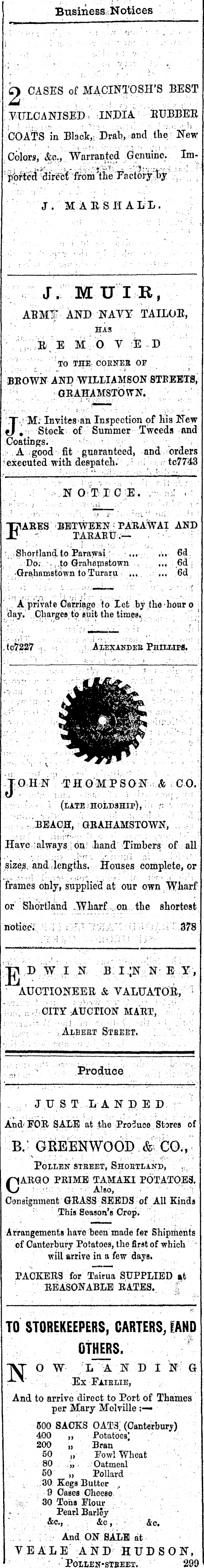 Business Notices Q CASES of MACINTOSH'S BEST VULCANISED. INDIA RUBBER COATS in Black, Drab, and the New Colors, &c, Warranted Genuine. Imp'ofted direct from the Factory by J. MAES HALL. J. MUIR, ABMT AND NAVY TAILOE, HAS REMOVED TO THE COKNEB OF BROWN AND WILLIAMSON STEEBTS, GRAHAMSTOWN. J; M. Invites an Inspection of his New . Stock of Summer Tweeds and Coatings. A good fit guaranteed, and orders 1 executed with despatch. tc7743 NOTICE., ': . EARES BETWEEN PARAWAI AND TARABU.— - Shortland to Parawai 6d Do; to GrahajHßtown ... ,6d ■Grahnmstown to Turaru 6d A private Carriage to Let by the hour o day. Chargeß to euit the times. . tc7227 Axexahdeb Phillips. JOHN THOMPSON & CO. (late holdship), BEACH, GRAHAMSTOWN, Have always on hand Timbers of all sizes and lengths. Houses complete, or frames only, supplied at our own Wharf or Shortland -Wharf on the shortest notice. . 378 tjiDwiN bi;nney, AUCTIONEER & VALUATOR, - , CITY .AUCTION HART, , Albej&t Stbeet. Produce JUST LANDED And- FOR SALE at the Produce Stares of B. GREENWOOD & CO., Pollen stbeet, Shobtland, CARGO PRIME TAMAKI POTATOES. Also, Consignment GRASS SEEDS of All Kinds This Season's Crop. Arrangements hare been made for Shipments of Canterbury Potatoes, the first of which " will arrive in a few days. PACKERS for Tairua SUPPLIED at REASONABLE RATES. TO STOREKEEPERS, CARTERS, lAND OTHERS. TVT O W LANDING -*-^' Ex Faiblie, And to arrive direct to Port of Thames per Mary Melville ;— 600 SACKS OAT 3. (Canterbury) 400 „ Potatoes) 200 „ Bran 50 „ Fowl Wheat 80 „ Oatmeal 50 „ Pollard 30 Kegs Butter f 9 Cases Cheese 30 Tons Flour Pearl Barley &c, &c, he. And ON SALE at VEALE AND HUDSON, POLLEN-STBEET. 299