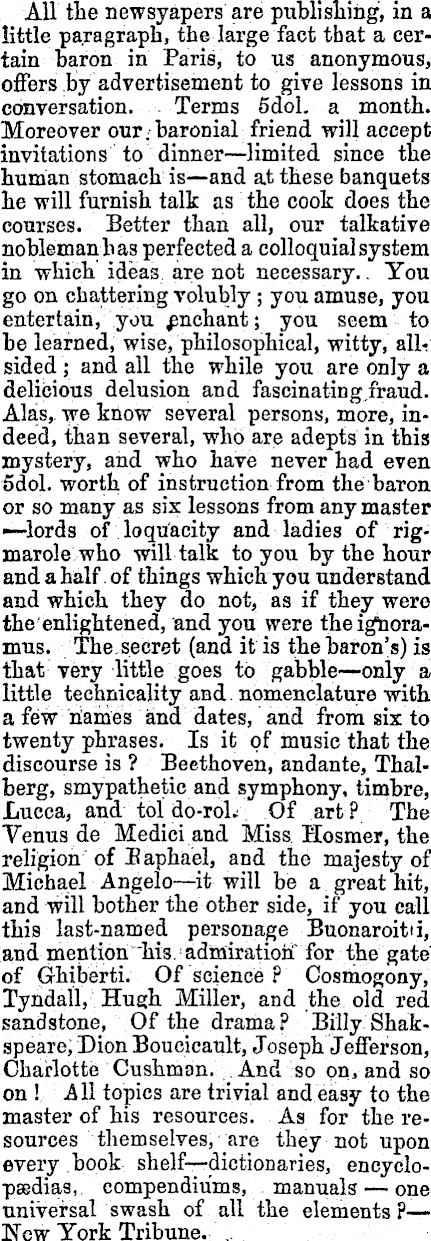 All the newsyapers are publishing, in a little paragraph, the large fact tbat a certain baron in Paris, to us anonymous, offers .by advertisement to give lessons in conversation. Terms sdol. a month. Moreover our/baronial friend will accept invitations to dinner —limited since the human stomach is—and at these banquets he will furnish talk as the cook does the courses. Better than all, our talkative nobleman lias perfected a colloquial system in which ideas are not necessary.. You go on chattering volubly; you amuse, you entertain, you ; you seem to be learned, wise, philosophical, witty, allsided ; and all the while you are only a delicious delusion and fascinating.fraud. Alas,, we know several persons, more, indeed, than several, who are adepts in this mystery, and who have never had even sdol. worth of instruction from the baron or so many as six lessons from any master —lords of loquacity and ladies of rigmarole who will talk to you by the hour and a half of things which you understand and which they do not, as if they were the enlightened, and you were the ignoramus. The.secret (and it is the baron's) is that very little goes to gabble—oniy a little technicality and. nomenclature with a few names and dates, and from six to twenty phrases. Is it of music that the discourse is ? Beethoven, andante, Thalberg, smypathetic and symphony, timbre, Lucca, and tol do-rol/; Of art? The Venus de Medici and Miss Hosmer, the religion of Baphael, and the majesty of Michael Angelo—it will be a great hit, and will bother the other side, if you call this last-named personage Buonaroitii, and mention "Ms.! admiration" for the gate" of Ghiberti. Of science ? Cosmogony, Tyndall, Hugh Miller, and the old red sandstone, Of the drama? Billy Shakspeare, Dion Boucicault, Joseph Jefferson, Charlotte Cushmon. . And so on, and so on ! All topics are trivial and easy to the master of his resources. As for the resources themselves, are they not upon every book shelf—dictionaries, encyclopaedias, compendiu'ms, manuals — one universal swash of all the elements ?— New York Tribune.