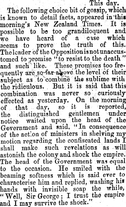 . This day. The following choice bit of gossip, which is known to detail facts, appeared in "this morning's New Zealand Times. It ia possible to be too grandiloquent and we have heard of a case which seems to prove the truth of this. The leader of the Oppositionis not unaccustomed to promise "to resist to the death " and such" like. These promises too frequently are.jQ-fiuT' afcove the level of their subject as lo'combiiie the sublime with the ridiculous. . But it is said that this combination was never so" curiously effected as yesterday. On the morning of that day, so it is reported, the distinguished gentlemen under notice waited upon "the head of the Government and said, "In consequence of the action of ministers in shelving my motion regarding the confiscated lands I shall make such revelations as will astonish the colony and shock the empire. The head of the Government was equal to the occasion. He smiled with the beaming softness which is said ever to characterise him and replied, washing his hands with invisible soap the while, " Well, Sir George; I trustee empire and I may survive the shock."