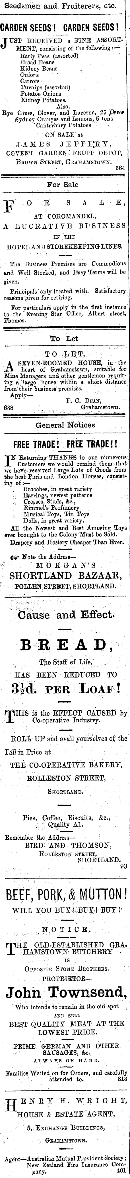 Seedsmen and Fruiterers, etc. GARDEN SEEDS! GARDEN SEEDS! JUST EEOEIVBD a FINE ASSOETMENT, consisting of the following :— Early Peas (assorted) Broad Beans . Kidney Beans „ Oniors Carrots Turnips (assorted) Potatoe Onions Kidney Potatoes. Albo, Eye Grass, Clover, and Lucerne, 25.Cases Sydcey Oranges and Lemons, 5 tons "Canterbury Potatoes ■ ON SALE'at JAMES JEFPE^T, COTENT GAEDEN-." EEUIT DEPOT, Beown Steebt, Gkahamstown. 564. - For Sale ~rp o;:;'-b; s a l c, AT COEOMANDEL, A LUCEATIYE BUSINESS IN 'THE HOTEL AND STOEEKEEPING LINES. Tho Business Premises are Commodious and Well Stocked, and Easy Terms will be given. : Principals' only treated with. Satisfactory. reasons given for retiring. For particulars apply in the first instance to the Evening Star. Office, Albert street, Thames. To Let . TQrLET, A SEVEN-BOOMED HOUSE, in the heart of Grahamstown, Buitable for Mine Managers and. other gentlemen requiring a large houße within a short distance from their business premises. ' . Apply— F. C. Dean, 688 '..., . , « Grahamstown. General Nptices FREE TRADEUttEE TRADE!! IN Eeturning THANKS to our numerous. Customers we would remind them that we have received Lai ge Lots of Goods from the beslb Paris and London Houses,' consisting oil— Brooches, in great variety .. Earrings,, newest patterns :; -• : Crosses, Stads, &c, , Eimmel's Perfumery Musical' Toys, Tin Toys Dolls, in great variety. All the Newest and Best Amusing Toys ever brought to the Colony lifust be Sold. Drapery and Hosiery Cheaper Than Ever. GiS 11 Note the Addresß— MORGAN'S SHORTLAND BAZAAR, POLLEN STBIET, SHOjRTLAND. Cause and Effect. BEE AD, .;,,;'/ The Staff of Life,' HAS BEEN BJSDUCED TO 3icL per Lo^f! THIS is the EFFECT CAUSED by Co-operative Industry. EOLL UP and avail yourselves of the Fall in Price at THE CO-OP'EEATIVE BAKERY, . EOLLESTON STREET, Shoetland. Pies, Coffee, Biscuits, &c, ;; > Qiwlity Al. : ; : f. Eemember the Address— \ BIRD: AND THOMSON, RoLIiESTON STEEET, SHOETLAND. 93 BEEF, PORK,& MUTTON! WILL YOU BUYKBUY;! BUY !• NOTICE. THE OLD-ESTABLISHED GRAHAMSTOWN- BUTCHERY • is Opposite Stone Beothebs. PKOPEIBTOJR— John Townsend, Who intends to remain in the old spot , AUD SEMi BE.S^T QU-^WTY MEAT AT THE LOWEST PRICE. PEIMB GEEMAN AND OTHER SAUSAGES, &c. AIWAT/S OH HAND. Families Wetted on for Orders, and carefully . attended to. 813 TT E N R V H. WRIGHT, HOUSE & ESTATE"AGENT, ■■'.; 5,, Exchange Buildings, : / , Gbahamstown. gent—-Australian Mutual Provident Society j New Zealand Fire Insurance Company. 401