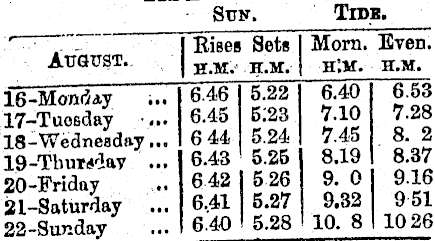 Sun. TIDB. AtfGTTST.. I Bises Sets Morn. Even. I H.M.' H.M. H'.H. H.M. 16-MondAT i.. 6.46 5.22 &40 6^53 17-Tuo 6 aay •/.. 6.45 5;23 V.lO 7.28 18-Wednesday... 644 5.24 7.45 8. 2 lg-Tbuw^ay ... 6.43 5.25 8.19 8.37 20-Friday .. 642 526 9. 0 916 Si-Saturday ... 6.41 5.27 9.32 951 22-Sur.day ... 6.40 5.28 10. 8 1026