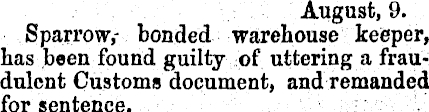 August, 9. Sparrow,- bonded warehouse keeper, lias been found guilty of uttering a fraudnlcnt Customs document, and remanded for sentence. ■