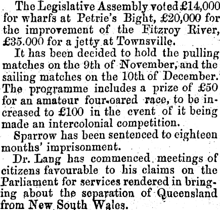 . The Legislative Assembly voted£l4,ooo for wharfs at Petrie's Bight, £20,000 for the improvement of the Fitzroy Eiver, £35.000 for a jetty at Townsville. . It has been decided to hold the pulling matches on the 9th of ■November, and the sailing matches on the 10th of December.' The programme includes a prize of £50 for an amateur four.oared race, to be increased to £100 in the event of it being made an intercolonial competition. Sparrow has been sentenced to eighteen months' imprisonment. Dr. Lang has commenced, meetings of citizens favourable to his claims on the Parliament for services rendered in bringing about the separation of Queensland from New. South Wales.