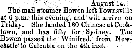 • ' ■■ • •.,;--r:>^:;:^_'-- ' ■-■ - ' August 14,. The mail steamer Bowen left Townsville at' 6 p.m. this evening, and will arrive on Friday. She landed 130 Chinese at Cooktown, and has fifty for-Sydney. The Bowen passed the Winifred, from New-" castle to Calcutta on the 4th inst.