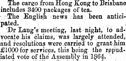 The cargo from Hong Kong to Brisbane includes 3400 packages of tea. The English news has been anticipated. . j Dr Laug's meeting, last night, 16 advocate his claims, was largely attended, and resolutions were carried to granfchim £1000 for services, this tjeing the repudiated vote of the Assembly in 1^64 "