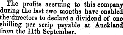 The profits accruing to this company during the last two months have enabled the directors to declare" a dividend of one shilling per scrip payable at Auckland from the 11th September.