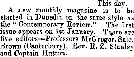 This day. A new monthly magazine is to be started in Dunedin on the same style as the " Contemporary Review." The first issue appears on Ist January. Ttiere are five editors —Professors McGregor, Sale, Brown (Canterbury), Rev. R. Z. Stanley and Captain Hutton.