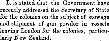 It is stated that the Government have recently addressed the Secretary of State for the colonies on the subject of stowage and shipment of gun powder in vessels leaving London for the colonies, particularly New Zealand.
