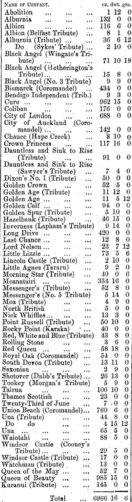 Name of Compaxt. oz. dwt. gra.. Abolition 1 12 0 Albuvnia 132 0 0 Albion 116 G 0 Albion (Belfast Tribute) ... 8 10 Alburnia (Tribute) ... ... 36 612 Do (Sykes* Tribute) ... 210 0 Black Angel (Wingate's Tribute) ... ... ... 71 10 18 Blach Angel (rietherington's Tribute)... ... ... 15 8 0 Black Angel (No. 3 Tribute) 9 9 0 Bismarck (Coromandel) ... 434 0 0 Bendigo Independent (Trib.) 9 3 0 Cure ... 962 15 0 Coliban ... 176 0 0 City of London ... ... 688 0 0 City of Auckland (Coromandel), 142 0 0 Chance (Hape Creek) ... *8 10 o Crown Princess ... ... 117 16 0 Dauntless and Sink to Rise (Tribute) ...... 91 0 0 Dauntless and Sink to Rise (Sawyer's Tribute) ... 7 4 0 Dixon's No. 1 (Tribute) ... 50 0 0 Golden Crown .... ... 52 5 0 Golden Age (Tribute) ... 11 12 0 Golden Age 11 5 12 Golden Calf ... 94 0 0 Golden Spur (Tribute) ... 5 10. 0 Hazelbank (Tribute) ... 46 15 0 Inverness (Lapham's Tribute) 914 0 Long Drive 420 0 0 Last Chance ... ... ... 12 8 0 Lord Nelson ... 23 712 Little Lizzie ... 73 5 6 Lincoln Castle (Tribute) "... 2 10 0 Little Agnes (Tararu) ... 9 2 0 Morning Star (Tribute) ... 40 0 6 Moanataivi ... 354 16 0 Messenger's (Tribute) ... 52 8 0 Messenger's (No. 5 Tribute) 514 0 Moa (Tribute) ... ... 4 9 0 North British 5 0 0 Nick Whiffles ... 13 3 0 Point Russell (Tribute) ... 50 10 0 Rocky Point (Karaka) • ... 40 0 0 Bed, White and Blue (Tribute) 43 8 0: Rolling Stone ...... 3 6 0 Red Queen ... 58 18 0 Royal Oak (Coromandel) ... 54 0 0 South Devon (Tribute) ... 13 11 0 Saxonian -''.' 2 9 0 Shotovcr (Dabb's Tribute)... 26 13 0 Tookey (Morgan's Tribute) 5 9 0 Tairua ... 106 10 0 Thames Scottish 23 0 0 Twenty-Third of June ... 7 .0 0 Union Beach (Coromandel)... 760 6 0 Una (Tribute) ... ... 44 8 0 Do do ... ... 4 15 12 Una ... ... 65 5 0 Waiotahi 88 5 0 Windsor Castie (Cooney's Tribute)... , 29 5 0 Windsor Castle (Tribute) ... 17 0 0 Watchman (Tribute) ... 13 0 0 Queen of the May 52 7 0 Queen of Beauty ... ... 985 15 0 Kuranui (Tribute) 145 0 Q Total ... 6900 16 6