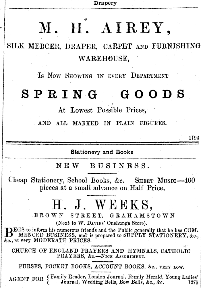 Drapery M. H* AIREY, SILK MEECER, DRAPER, CARPET and FURNISHING WAREHOUSE, Is Now Showing in evert Department SPRING GOODS At Lowest Possible Prices, AND ALL MABKED IN PLAIN FIGURES. ■ _ 1193 Stationery and Books NEW BUSINESS. | Cheap Stationery, School Books, &c. Sheet Music—4oo pieces at a small advance on Half Price, H. j.~weeks, BE OWN STEEET, GBAHAMSTOWN (Next to W. Davies' Onehunga Store). BEGS to inform his numerous friends and the Public generally that he has COMMENCED BUSINESS, and is prepared to SUPPLY STATIONEEY, &c, &c, at my MODEEATE PEICES. CHUECH OF ENGLAND PEAYEES AND HYMNALS, CATHOLIC PJBAYEBS, &c—Nice Assobiment. PUESES, POCKET BOOKS, ACCOUNT BOOKS, &c, veby iow. Ar"T7TMT urn? f Family Eeader, London Journal, Family Herald, Younc Ladies' AlxliJNl l<Uli £ Journal, Wedding Bells, Bow Bells, &c, Ac. 1275
