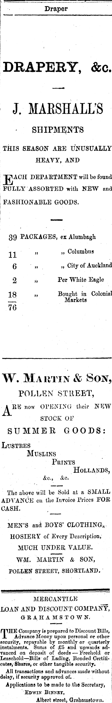 Draper DRAPERY, &c. J. MARSHALL'S SHIPMENTS THIS SEASON ABE UNUSUALLY HEATY, AND TpIACH DEPARTMENT will be found FULLY ASSORTED with. NEW and FASHIONABLE GOODS. 39 PACKAGES, ex Alumbagh. I-.,, „ Columbus Q „ „ City of Auckland 2 „ Per "White Eagle 18 „ Bought in Colonial ; Markets 76 W..Martin & Son, POLLEN STREET, A RE now OPENING their NEW STOCK OF SUMMER GOODS: LUSTEES Muslins ' ■ Prints Hollands, &C, &G. ! The above will be Sold at a SMALL ! ADVANCE ou the Invoice Prices FOR I CASH. / I MEN'S and BOYS' CLOTHING* HOSIERY of Every Description, MUCH UNDER VALUE. WM. "'MARTIN & SON, POLLEN STREET, SHOETLAND. MERCANTILE LOAN AND DISCOUNT COMPANY, GBAHAMSTOWN. fPHE Company is prepared to Discount Bills, A Advance Money upon personal or other security, repayable by monthly or quarterly instalments. Sums of £5 and upwards advanced on deposit of deeds — Freehold or Leasehold —Bills of Lading, Bonded Certificatesy Shares, or other tangible security. All transactions and advances made without delay, if security approved of. . .";, " Applications to be made to the Secretary, Edwin Biknbt, Albert street, Grabauistcwn.