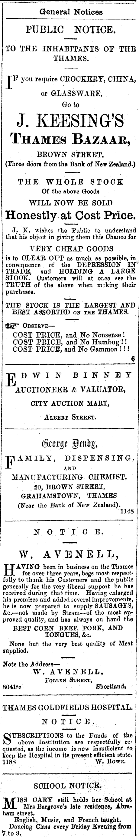 General Notices PUBLIC NOTICE. TO THE INHABITANTS OF THE THAMES. TF you require CEOCKEEY, CHINA, or GLASSWAEE, Goto J. KEESINGTS Thames Bazaar, BEOWN STBEET, (Three doort from th« Bank of New Zealand.) THE WHOLE STOCK Of the above Goods WILL NOW BE SOLD Honestly at Cost Price. J. K. wishes the Public to understand that his object in giving them this Chance for VEEY CHEAP GOODS is to CLEAR OUT as much as possible, in, consequence of the DEPRESSION IN' TRADE, ond HOLDING A LARGE STOCK. Customers •will at once fee the TRUTH of the above when nuking their purcheses. THE STOCK IS THE LARGEST AND BEST ASSORTED ox the THAMES. Ugp" Observe— COST PEICE, and No Nonsense! COST PEICE, arid No Humbug!! COST PEICE, and No Gammon!!! ■ 6 TjIDWIN BINNEY AUCTIONEEE & VALUATOE, CITY AUCTION MART, AIBEET STBEET. <&e.ovp §&tty t FAMILY, DISPENSING., AND MANUFACTUEING CHEMIST, . 20, BROWN STREET, GRAHAMSTOWN, THAMES (Near the Bank of New Zealand). 1148 N O T I C E. W. AVENELL, HAVING been in business on the Thames for over three years, begs most respectfully to thank, his Customers and the public generally for the very liberal support he has received during that time. Having enlarged his premises and added e everal improvements, he is now prepared to supply SAUSAGES, &c—not made by Steam—of the most approved quality, and baa always on hand the BEST CORN BEEF, POSK, AND TONGUES, &c. None but the very best quality of Meat supplied. Note the Address— W. AVENELL, FOEtEK STBBBT, 8041tc Shortland; thames goldfields hospital. notTce. . SUBSCRIPTIONS to the Funds of the >O above Institution are respectfully reqnested, as tha income is now insufficient to. keep the Hospital in its present efficient state. 1188 . W. Rove. ! SCHOOL NOTICE. MISS CARY still holds her School at Mrß Bargrove's late residence, Abra* '■■ ham street. | English, Mu3ic, and French taught. Dancing Claes every Friday Evening from 7 to 9.