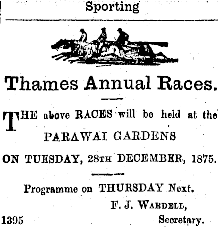 Sporting Thames Annual Kaces. mHE above BAOES will be held at the PARA WAI GARDENS ON TUESDAY, 28th DECEMBER, 1875. Programme on THURSDAY Next. F. J. Wabdbix, 1395 . Secretary.