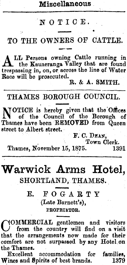 Miscellaneous N OTICE. TO THE OWNERS OF CATTLE. ALL Persons owning Cattle running in the Kauaeranga Valley that are found trespassing in, on, or across the line of Water Race will be prosecuted. R. & A. SMITH. THAMES BOROUGH COUNCIL. NOTICE is hereby given that the'Ofltaes of the Council of the Borough of Thames have been RBMOTED from Queen street to Albert street. F. C. DeAK, Town Clerk. Thames, November 15,1875. 1391 Warwick Arms Hotel, SHORTLAND, THAMES. E. F O~gTa BTY (Late Barnett's), EBOPBIBTOB. /COMMERCIAL gentlemen and visitors V^ from the country will find on a visit that the arrangements now made for their comfort are not surpassed by any Hotel.on the Thames. Excellent accommodation for families, Wines and Spirits of best brands. 1379 j