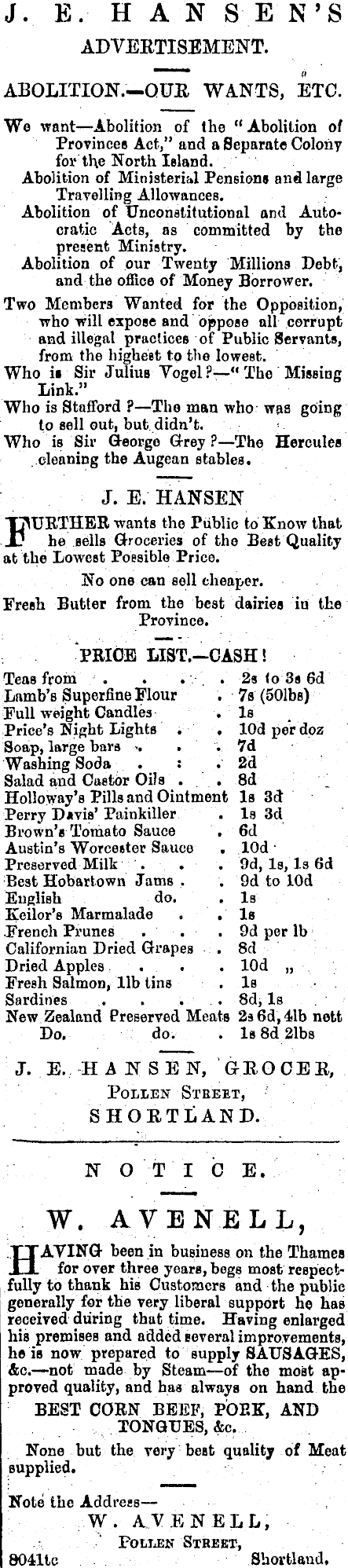 J. E. H AN SEN'S ADVERTISEMENT. ABOLITION.—OUR WANTS, ETC. We want —Abolition of the "Abolition of Provinces Act," and a Separate Colony for the North Island. \ Abolition of Ministerial Pensions and large Travelling Allowances. Abolition of Unconstitutional and Autocratic Acts, as committed by the present Ministry. Abolition of pur Twenty Millions Debt, and the office of Money Borrower. Two Members Wanted for the Opposition, who will expose and oppose all corrupt and illegal practices of Public Servants, from the highest to the lowest. Who ii Sir Julius Vogel ?—" The Missing Link." Who is Stafford ?—The man who was going to sell out, but didn't. Who is Sir George Grey ?—The Hercules cleaning the Augean stables. J. E. HANSEN FURTHER wants the Public to Know that he jells Groceries of the Best Quality at the Lowest Possible Price. No one can sell cheaper. Fresh Butter from the best dairies in the Province. PRICE LIST.—CASH! Teas from . . .■;.-'. . 2s <o 3s 6d Lamb's Superfine Flour . 7fl (sOlbs) Full weight Candles . Is Price's Night Lights . . lOd per dpz Soap, large bars >. . ".. 7d Washing Soda . : . 2d Salad and Castor Oils . . 8d Holloway's Pills and Ointment Is 3d" Perry Davis'Painkiller . Is 3d Brown's Tomato Sauce . 6d Austin's Worcester Sauce . lOd • | Preserved Milk . . . 9d, Is, Is 6d Best Hobartown Jams . . 9d to lOd English do. . Is Keilor's Marmalade . . Is .French Prunes . . . 9d per lb Californian Dried Grapes . 8d Dried Apples.. ■ . . . . lOd „ Fresh Salmon, lib tins . Is • . Sardines . . . . Bd, Is . New Zealand Preserved Meats 2s6d,4lbnett Do. do. . Isßd2lbs J. E. HANS EN, GEOOE E, Pollen Street, ■ SHOETLAKD. N O T I C E. W. AVENELL, HAVING been in business on the Thames for over three years, begs most respectfully to thank his Customers and the public generally for the very liberal support ho has received during that time. Braving enlarged his premises and added several improvements, he is now prepared to supply SAUSAGES, &c—* not made by Steam—of the most approved quality, and has always on hand the BEST CORN BEEP, POKE, AND TONGUES, &c. None but the very beat quality of Meat supplied. '■; ■ Note the Address— W. AVENELL, .r, ' Pollen Street, 8041tc Shortland,